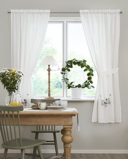 Gi hjemmet ditt en koselig følelse med våre vakre gardinlengder med eksklusiv broderi. Den klassiske designen kombinerer romantisk sjarm med høy kvalitet og skaper en innbydende atmosfære på kjøkkenet ditt. Den myke kvaliteten og den detaljerte broderien gir gardinlengdene et eksklusivt uttrykk og en landlig touch. Perfekt for deg som vil skape en hjemmekoselig og stilfull innredning med sans for detaljer.
