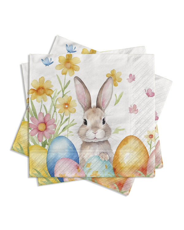 Servietter med et påskemotiv av en søt hare omgitt av pastellfargede egg – en herlig detalj som skaper god stemning rundt påskebordet.