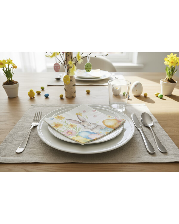 Servietter med et påskemotiv av en søt hare omgitt av pastellfargede egg – en herlig detalj som skaper god stemning rund...