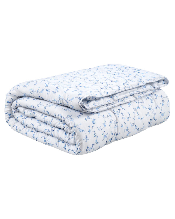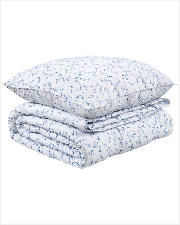 Denne sommerdynen med romantisk blomstermønster er det perfekte valget for varmere netter når du vil sove svalt. Det hvite stoffet med små blå blomster ranker gir soverommet en lys, frisk og tidløs følelse – helt ideelt for sommerens oppredning både på soverommet og i sommerhuset.
